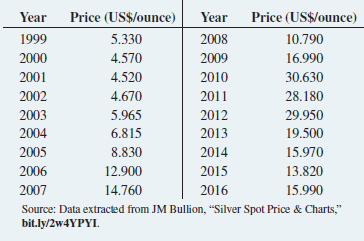 The file Silver contains the following prices in London for an ounce of silver (in US$) on the last day of the year from 1999 to 2016: