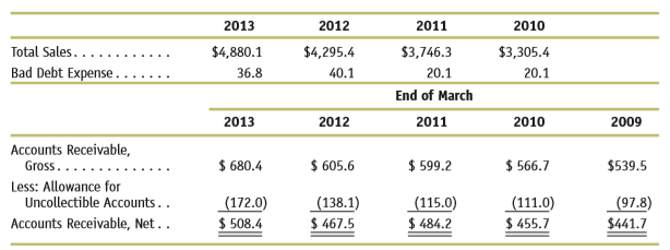 2013 2012 2011 2010 Total Sales. $4,880.1 $4,295.4 $3,746.3 $3,305.4 Bad Debt Expense. 36.8 40.1 20.1 20.1 End of March 2013 2012 2011 2010 2009 Accounts Receivable, $ 680.4 $ 605.6 $ 599.2 $ 566.7 $539.5 Gross.... Less: Allowance for Uncollectible Accounts.. (172.0) $ 508.4 _(138.1) $ 467.5 (115.0) $ 484.2 (111.0) $ 455.7 (97.8) $441.7 Accounts Receivable, Net..