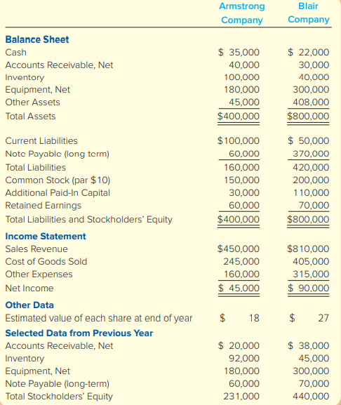 The companies are in the same line of business and are direct competitors in a large metropolitan area. Both have been in business approximately 10 years and each has had steady growth. Despite these similarities, the management of each has a different viewpoint in many respects. Blair is more conservative, and as its president said, âWe avoid what we consider to be undue risk.â Both companies use straight-line depreciation, but Blair estimates slightly shorter useful lives than Armstrong. No shares were issued in the current year and neither company is publicly held. Blair Company has an annual audit by a CPA, but Armstrong Company does not. Assume the end-of-year total assets and net equipment balances approximate the yearâs average and all sales are on account.