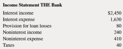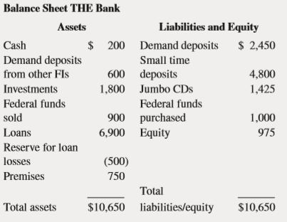 Balance Sheet THE Bank Assets Liabilities and Equity Cash $ 200 Demand deposits $ 2,450 Demand deposits Small time from other FIs 600 deposits 4,800 Investments 1,800 Jumbo CDs 1,425 Federal funds 900 purchased 6,900 Equity Federal funds sold 1,000 Loans 975 Reserve for loan losses (500) 750 Premises Total Total assets $10,650 liabilities/equity $10,650 Income Statement THE Bank Interest income $2,450 Interest expense 1,630 Provision for loan losses 80 Noninterest income 240 Noninterest expense 410 Taxes 40