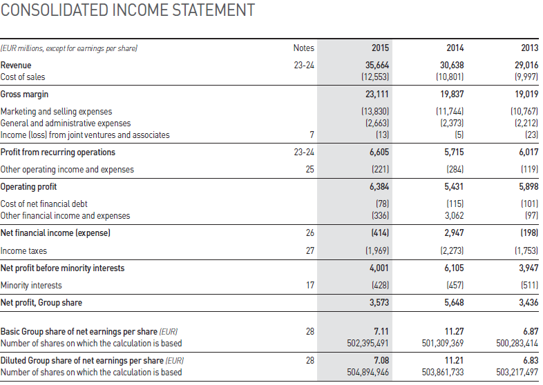 CONSOLIDATED INCOME STATEMENT (EUR millions, except for earnings per share) Notes 2015 2014 2013 23-24 29,016 (9,997) Revenue 35,664 (12,553) 30,638 (10,801) Cost of sales Gross margin 23,111 19,837 19,019 Marketing and selling expenses General and administrative expenses Income (loss) from joint ventures and associates (13,830) (2,663) (13) (11,744) (2,373) (5) (10,767) (2,212) (23) 7 Profit from recurring operations 23-24 6,605 5,715 6,017 Other operating income and expenses 25 (221) (284) (119) Operating profit 6,384 5,431 5,898 (78) (336) (115) 3,062 (101) (97) Cost of net financial debt Other financial income and expenses Net financial income (ex pense) 26 (414) 2,947 (198) Income taxes 27 (1,969) (2,273) (1,753) Net profit before minority interests 4,001 6,105 3,947 Minority interests 17 (428) (457) (511) Net profit, Group share 3,573 5,648 3,436 11.27 501,309,369 6.87 500,283,414 Basic Group share of net earnings per share (EUR) 28 7.11 Number of shares on which the calculation is based 502,395,491 Diluted Group share of net earnings per share (EUR) 28 7.08 11.21 6.83 Number of shares on which the calculation is based 504,894,946 503,861,733 503,217,497 CONSOLIDATED STATEMENT OF COMPREHENSIVE GAINS AND LOSSES (EUR milions) 2015 2014 2013 Net profit before minority interests 4,001 6,105 3,947 Translation adjustments Так impact (346) (48) 631 534 135 104 766 638 (394) (32) (91) Change in value of available for sale financial assets 494 963 (3,326) (16) (35) Amounts transferred to income statement Таx impact 20 184 (103) (2,648) 912 (63) (30) (163) Change in value of hedges of future foreign currency cash flows 304 (265) (17) Amounts transferred to income statement 33 Таx impact 3 57 (27) (136) 22 Gains and losses recognized in equity, transferable to income statement 636 (2,146) 540 (17) (10) Change in value of vineyard land 64 369 Amounts transferred to consolidated reserves Таx impact (21) 9 (127) 43 (18) 242 Employee benefit commitments: change in value resulting from actuarial gains and losses Таx impact 42 (161) 80 (16) 52 (22) 26 (109) 58 Gains and losses recognized in equity, not transferable to income statement 69 (127) 300 Comprehensive income Minority interests 4,706 (558) 3,832 (565) 4,787 (532) Comprehensive income, Group share 4,148 3,267 4,255