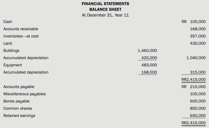 Financial Statements BALANCE SHEET At December 31, Year 11 Cash RR 105,000 Accounts receivable 168,000 Inventories-at cost 357,000 Land 430,000 Buildings 1,460,000 Accumulated depreciation 420,000 1,040,000 Equipment 483,000 Accumulated depreciation 168,000 315,000 RR2,415,000 Accounts payable RR 210,000 Miscellaneous payables 105,000 Bonds payable 600,000 Common shares 850,000 Retained earnings 650,000 RR2,415,000 RETAINED EARNINGS STATEMENT Balance, January 1 RR 470,000 Net income 630,000 1,100,000 Dividends 450,000 Balance, December 31 RR 650,000 INCOME STATEMENT Sales RR3,150,000 Cost of sales 1,680,000 Other expenses 840,000 2,520,000 Net income RR 630,000 Jan. 1, Year 11 $1 = RR28.00 $1: $1 = RR28.09 Dec. 31, Year 11 RR28.20 Average for Year 11