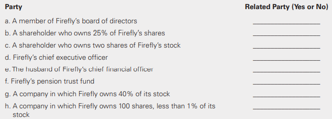 The Firefly Company is preparing its annual financial statements and needs to identify all its related parties. Which of the following would be related parties of the Firefly Company?
