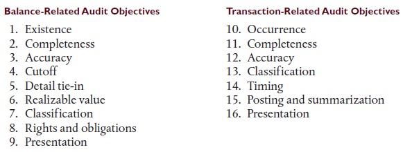 Balance-Related Audit Objectives Transaction-Related Audit Objectives 1. Existence 2. Completeness 3. Accuracy 4. Cutoff 10. Occurrence 11. Completeness 12. Accuracy 13. Classification 5. Detail tie-in 6. Realizable value 7. Classification 8. Rights and obligations 9. Presentation 14. Timing 15. Posting and summarization 16. Presentation