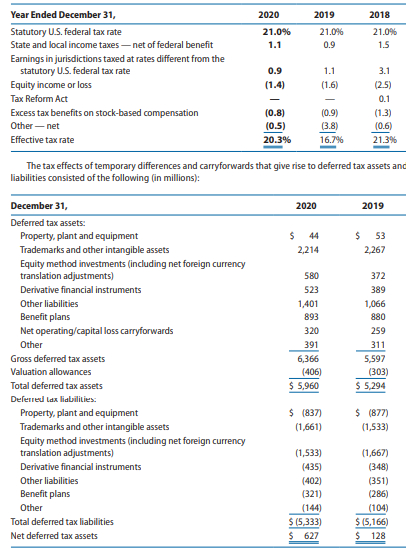 The following are excerpts from Note 14 (Income Taxes) to the 2020 Consolidated Financial Statements of Coca-Cola Company (Coca-Cola): A reconciliation of the statutory U.S. federal tax rate and our effective tax rate is as follows: