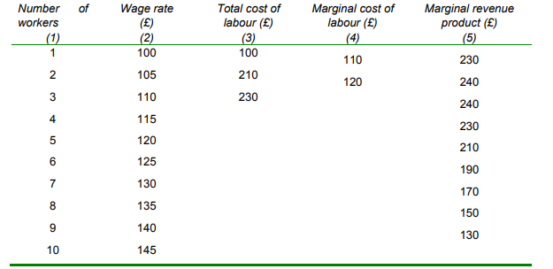Marginal Cost of labour (£) Number of Wage rate (£) (2) 100 Total cost of labour (£) (3) 100 Marginal revenue product (£) (5) workers (1) (4) 1 110 230 2 105 210 120 240 110 230 240 4 115 230 120 210 6. 125 190 7 130 170 8 135 150 140 130 10 145 3.