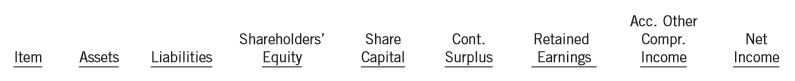 (a) In the table below, assuming the company follows IFRS (including IAS 39), indicate the effect that each of the 13 transactions has on the financial statement elements that are listed. Use the following codes: increase (I), decrease (D), and no effect (NE). Indicate I/D where there is both an increase and a decrease to the same element.