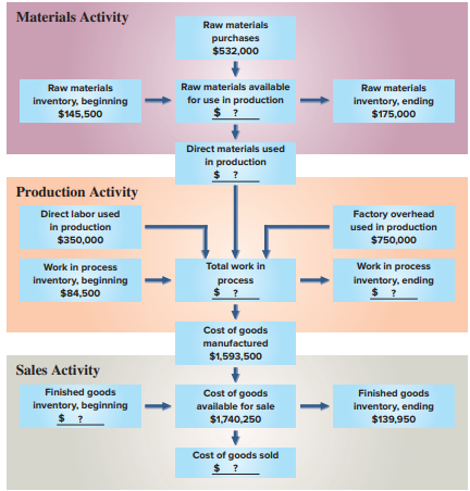 The following chart shows how costs flow through a business as a product is manufactured. All boxes in the chart show cost amounts. Compute the cost amounts for the boxes that contain question marks.