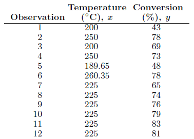 The following data are a result of an investigation as to the effect of reaction temperature x on percent conversion of a chemical process y. (See Myers, Montgomery and Anderson-Cook, 2009.) Fit a simple linear regression, and use a lack-of-fit test to determine if the model is adequate. Discuss.