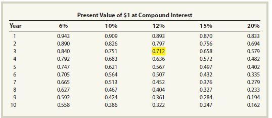 Net Income Net Cash Flow $14,000 18,000 Year 1 $ 4,100 Year 2 8,100 Year 3 7,100 2,100 17,000 12,000 Year 4 Present Value of $1 at Compound Interest Year 6% 10% 12% 15% 20% 1 0.943 0.909 0.893 0.870 0.833 2 0.890 0.826 0.797 0.756 0.694 3 0.840 0.751 0.712 0.658 0.579 4 0.792 0.683 0.636 0.572 0.482 0.747 0.621 0.567 0.497 0.402 6. 0.705 0.564 0.507 0.432 0.335 7 0.665 0.513 0.452 0.376 0.279 8. 0.627 0.467 0.404 0.327 0.233 9 0.592 0.424 0.361 0.284 0.194 10 0.558 0.386 0.322 0.247 0.162