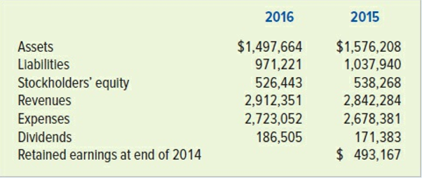 2016 2015 $1,497,664 971,221 526,443 2,912,351 2,723,052 186,505 $1,576,208 1,037,940 Assets Liabilities Stockholders' equity 538,268 2,842,284 2,678,381 171,383 $ 493,167 Revenues Expenses Dividends Retained earnings at end of 2014