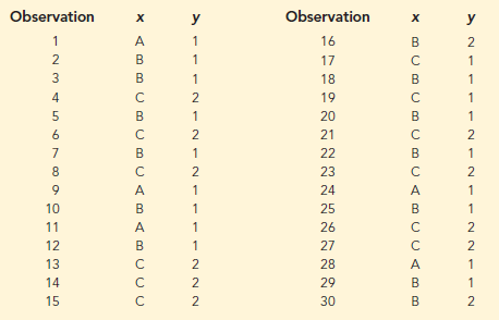 The following data are for 30 observations involving two categorical variables, x and y. The categories for x are A, B, and C; the categories for y are 1 and 2.