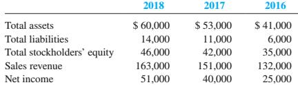 2018 2017 2016 Total assets $ 60,000 $ 53,000 $ 41,000 Total liabilities 14,000 11,000 6,000 Total stockholders' equity 46,000 42,000 35,000 Sales revenue 151,000 40,000 163,000 132,000 25,000 Net income 51,000