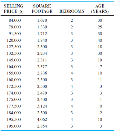 SELLING SQUARE AGE PRICE ($) FOOTAGE BEDROOMS (YEARS) 84,000 1,670 2 30 79,000 1,339 2 25 91,500 1,712 3 30 120,000 1,840 3 40 127,500 2,300 3 18 132,500 2,234 3 30 145,000 2,311 3 19 164,000 2,377 3 7 155,000 2,736 4 10 168,000 2,500 3 1 172,500 2,500 4 3 174,000 2,479 3 3 175,000 2,400 3 1 177,500 3,124 4 184,000 2,500 3 2 195,500 4,062 4 10 195,000 2,854 3 3