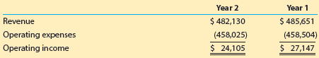 Year 2 Year 1 Revenue $ 482,130 $ 485,651 Operating expenses (458,025) (458,504) Operating income $ 24,105 $ 27,147