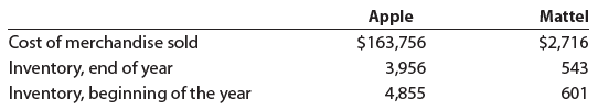 The following data (in millions) were taken from recent annual reports of Apple Inc., a manufacturer of personal computers and related products, and Mattel Inc., a manufacturer of toys, including Barbie®, Hot Wheels®, and Disney Classics: