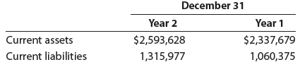 a. Compute the working capital and the current ratio as of December 31, Year 2 and Year 1. Round to two decimal places.