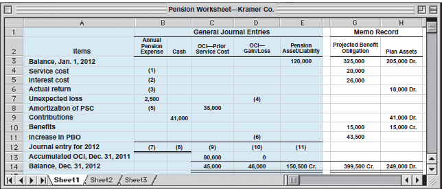 Penslon Worksheet-Kramer Co. A D E G H 1 General Jourmal Entrles Memo Record Annual OC-Prior Service Cost OC- Galn/Loss Projected Benent Oblgation Penslon Pension 2 Items Expense Asset/Llablity Plan Assets Cash 3. Balance, Jan. 1, 2012 120,000 325,000 205,000 Dr. 4 Service cost (1) 20,000 5 Interest cost (2) 26,000 6 Actual return (3) 18,000 Dr. 7 Unexpected loss 2,500 (4) Amortization of PSC (5) 35,000 Contributions 41,000 41,000 Dr. 10 Benefits 15,000 15,000 Cr. 11 Increase In PBO (6) 43,500 12 Journal entry for 2012 (7) (8) (9) (10) (11) 13 Accumulated OCI, Dec. 31, 2011 80,000 14 Balance, Dec. 31, 2012 45,000 46,000 150,500 Cr. 399,500 Cr. 249,000 Dr. Sheet1 Sheet2 Sheet3