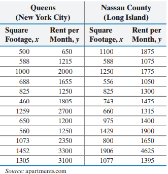 The following data represent the square footage and rent for apartments in the borough of Queens and Nassau County, New York.
