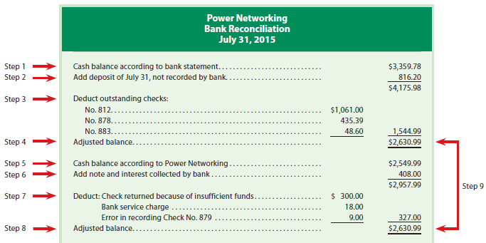 Power Networking Bank Reconciliation July 31, 2015 Step 1 Step 2 Cash balance according to bank statement.. Add deposit of July 31, not recorded by bank. $3,359.78 816.20 $4,175.98 Step 3 Deduct outstanding checks: No. 812.. $1,061.00 No. 878. 435.39 No. 883.. 48.60 1,544.99 Step 4 Adjusted balance. . $2,630.99 Step 5 Step 6 Cash balance according to Power Networking Add note and interest collected by bank. $2,549.99 408.00 $2,957.99 Step 9 Step 7 Deduct: Check returned because of insufficient funds. $ 300.00 Bank service charge . Error in recording Check No. 879 18.00 9.00 327.00 Step 8 Adjusted balance... $2,630.99