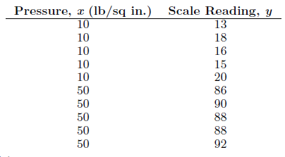 The following data were collected to determine the relationship between pressure and the corresponding scale reading for the purpose of calibration.