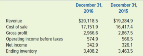 December 31, December 31, 2016 2015 $20,118.5 $19,284.9 16,417.4 Revenue Cost of sale 17,151.9 2,966.6 Gross profit Operating Income before taxes Net Income 2,867.5 566.5 574.9 342.9 326.1 Ending Inventory 3,408.2 3,463.5