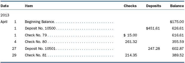 Date Item Checks Deposits Balance 2013 April 1 Beginning Balance. . $175.00 Deposit No. 10500. $451.61 626.61 1 Check No. 79. $ 15.00 616.61 4 Check No. 80 261.32 355.59 27 Deposit No. 10501. 247.28 602.87 29 Check No. 81. 214.35 389.52 April 1 Beginning Balance.. $136.00 Check No. 79. $ 15.00 121.00 3 Deposit No. 10499. $ 96.00 217.00 Check No. 80. 261.32 (44.32) Automatic Loan. 132.00 87.68 Deposit No. 10500. NSF Check .. 457.61 545.29 20 20.00 525.29 20 Service Charge. 15.00 510.29 30 Interest 1.21 511.50 ...... 3. LO