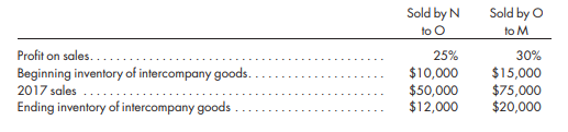 M Owns 90% Owns 20% N. Owns 40% Internally generated Dividends declared and paid $200,000 40,000 $90,000 10,000 $40,000 5,000 net income Sold by O Sold by N to O to M Profit on sales.. Beginning inventory of intercompany goods. 2017 sales 25% 30% $10,000 $50,000 $12,000 $15,000 $75,000 $20,000 Ending inventory of intercompany goods