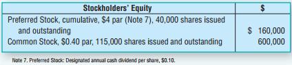 Stockholders' Equity 2$ Preferred Stock, cumulative, $4 par (Note 7), 40,000 shares issued and outstanding $ 160,000 Common Stock, $0.40 par, 115,000 shares issued and outstanding 600,000 Note 7. Preferred Stock: Designated annual cash dividend per share, $0.10.