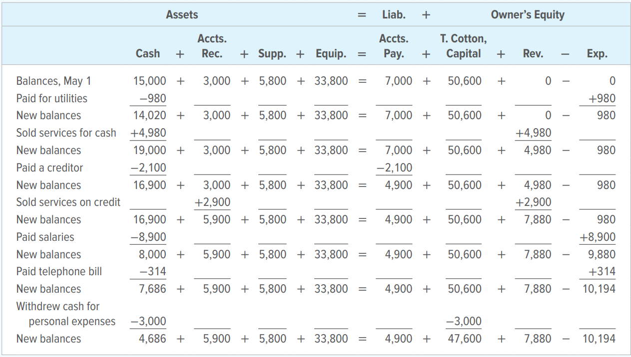 The following equation shows the transactions of Cotton Cleaning Service during May. The business is owned by Taylor Cotton.