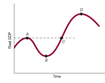 The following figure shows a business cycle. Identify each of the following as a phase of the business cycle: