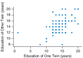 The following figure shows a scatterplot of the educational level of twins. Describe the scatterplot. Explain the trend and mention any unusual points. (Source: www.stat.ucla.edu)