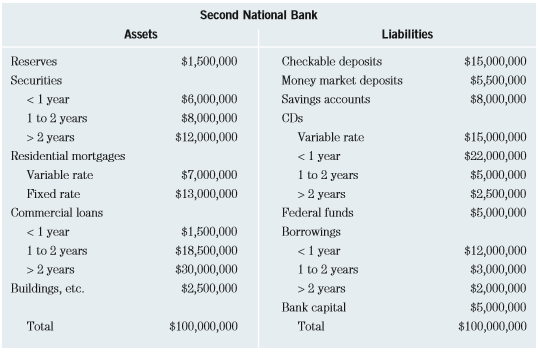 Second National Bank Assets Liabilities Reserves $1,500,000 Checkable deposits $15,000,000 Securities Money market deposits $5,500,000 <1 year 1 to 2 years $6,000,000 Savings accounts $8,000,000 $8,000,000 CDs > 2 years $12,000,000 Variable rate $15,000,000 <1 year 1 to 2 years Residential mortgages $22,000,000 Variable rate $7,000,000 $5,000,000 Fixed rate $13,000,000 > 2 years $2,500,000 Commercial loans Federal funds $5,000,000 <1 year 1 to 2 years >2 years $1,500,000 Borrowings <1 year 1 to 2 years $18,500,000 $12,000,000 $30,000,000 $3,000,000 Buildings, etc. $2,500,000 >2 years $2,000,000 Bank capital $5,000,000 Total $100,000,000 Total $100,000,000