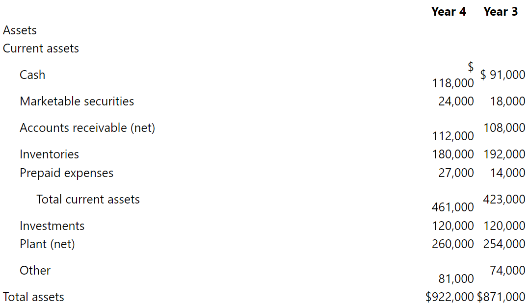 Table Summary: A table shows the Balance Sheets as of December 31 v. Column 1 has entries. Column 2 has year 4. Column 3 has year 3.