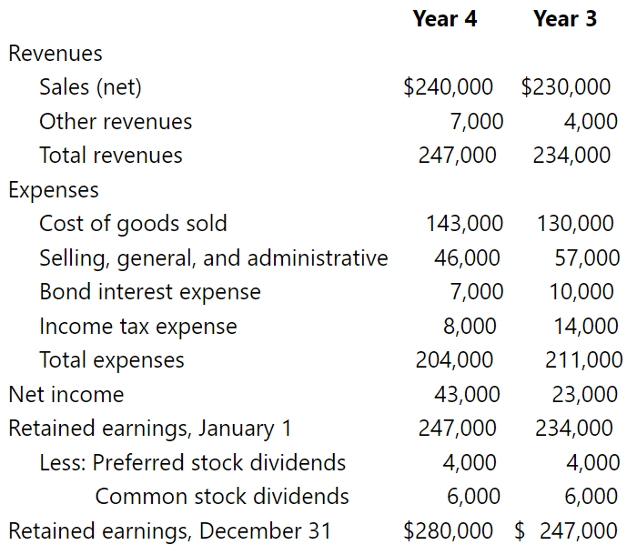 Table Summary: A table has three columns. Column 1 has entries. Column 2 has year 4. Column 3 has year 3. The Statements of Income and retained earnings for the years ended December 31 of Bedford Appliances Incorporated shows 3 columns. Column 1 has entries. Column 2 has year 4. Column 3 has year 3.