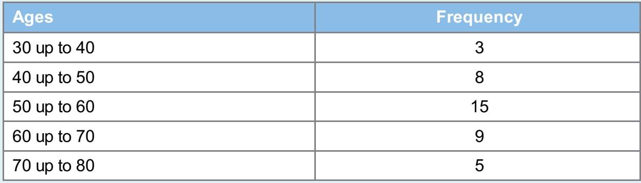 Ages Frequency 30 up to 40 3 40 up to 50 8 50 up to 60 15 60 up to 70 70 up to 80