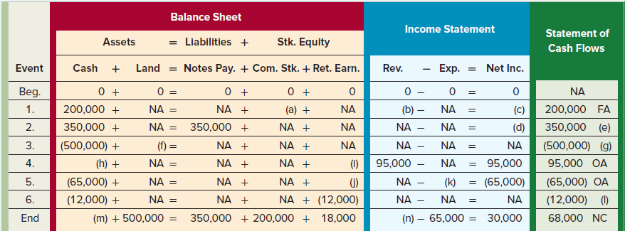 a. Use amounts or alphabetic letters to fill in the blanks highlighted by each character (a) through (n). Use the letters NA to indicate that no amount is related to the alpha character shown in the model. Use the letters FA to represent financing activity, IA to represent investing activities, OA to represent operating activities, and NC to represent net change.