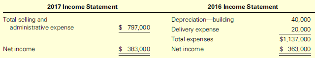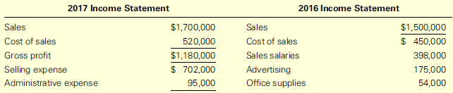 2017 Income Statement 2016 Income Statement Sales $1,700,000 Sales $1,500,000 Cost of sales 520,000 Cost of sales $ 450,000 Gross profit $1,180,000 Sales salaries 398,000 $ 702,000 Selling expense Administrative expense Advertising Office supplies 175,000 95,000 54,000 2017 Income Statement 2016 Income Statement Total selling and administrative expense Depreciation-building 40,000 $ 797,000 Delivery expense 20,000 Total expenses $1,137,000 Net income $ 383,000 Net income $ 363,000