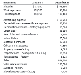 Inventorles January 1 December 31 Materials $ 77,350 $ 95,550 Work in process 109,200 96,200 Finished goods 113,750 100,100 $ 68,250 Advertising expense Depreciation expense-office equipment Depreciation expense-factory equipment 22,750 14,560 Direct labor 186,550 Heat, light, and power-factory 5,850 Indirect labor 23,660 Materials purchased Office salaries expense 123,500 77350 Property taxes-factory Property taxes-headquarters building Rent expense-factory 4,095 13,650 6,825 Sales 864,500 Sales salaries expense Supplies-factory Miscellaneous costs-factory 136,500 3,250 4,420
