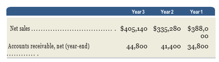 The following information is from the annual financial statements of Raheem Company. (1) Compute its accounts receivable turnover for Year 2 and Year 3. (2) Assuming its competitor has a turnover of 11, is Raheem performing better or worse at collecting receivables than its competitor?