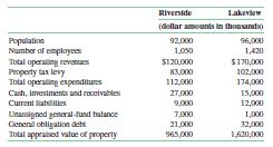 Riverside Lakeview (dollar amounts in thuasando Population Number of employees 92.000 S6,000 1,420 1,050 Total operaling revenus Property tax levy Total operating expendiltures S120,000 83,000 112.000 S170,000 102,000 174,000 Cash, investments and receivables Current lahties 27,000 15,000 12,000 9,000 Linassigned general-tund halance Cieneral obligation dete Total apprated value of property 21,000 565,000 1,000 32,000 1,620,000