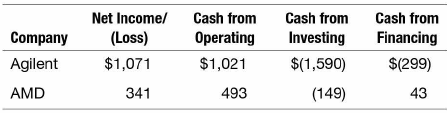 The following information was taken from the 2019 statements of cash flow for Agilent Technologies and Advanced Micro Devices (dollars in millions):