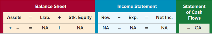 Assume that each of the events requires an end-of-period adjustment. Use a horizontal financial statements model to show how the adjustments affect the financial statements. Use increase (I) and decrease (D) to indicate how the adjustment affects each part of the horizontal statements model. Use the letters NA to indicate that a part of the model is not affected by the adjustment. In the Statement of Cash Flows column, indicate whether cash increases (I) decreases (D), or is not affected (NA). Also, indicate whether the cash flow was caused by an operating activity (OA), an investing activity (IA), or a financing activity (FA).