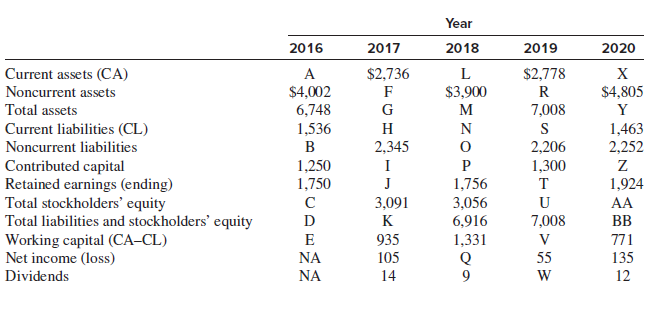 Year 2016 2017 2018 2019 2020 Current assets (CA) A $2,736 L $2,778 X Noncurrent assets $4,805 $4,002 6,748 1,536 F $3,900 R Total assets G M 7,008 Y 1,463 2,252 Current liabilities (CL) H N S Noncurrent liabilities В 2,345 2,206 1,300 Contributed capital Retained earnings (ending) Total stockholders' equity Total liabilities and Stockholders' equity Working capital (CA–CL) Net income (loss) 1,250 1,750 I P Z 1,756 3,056 6,916 1,331 Q J T 1,924 3,091 U AA D K 7,008 BB E 935 105 V 771 NA 55 135 Dividends NA 14 W 12