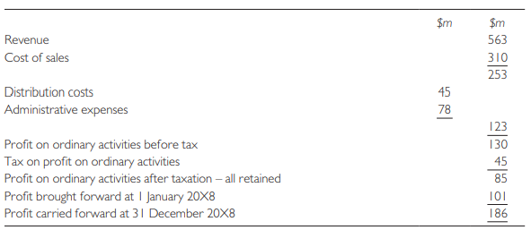 $m $m Revenue 563 Cost of sales 310 253 Distribution costs 45 Administrative expenses 78 123 Profit on ordinary activities before tax Tax on profit on ordinary activities Profit on ordinary activities after taxation – all retained 130 45 85 Profit brought forward at I January 20X8 101 Profit carried forward at 31 December 20X8 186