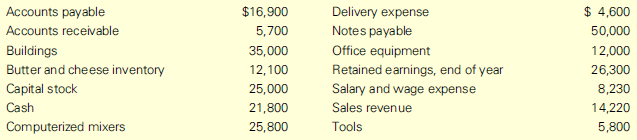 Accounts Payable $16,900 Delivery expense $ 4,600 Accounts receivable 5,700 Notes payable 50,000 35,000 Buildings Butter and cheese inventory Office equipment Retained earnings, end of year Salary and wage expense 12,000 12,100 26,300 Capital stock 25,000 8,230 Cash 21,800 Sales revenue 14,220 Computerized mixers 25,800 Tools 5,800
