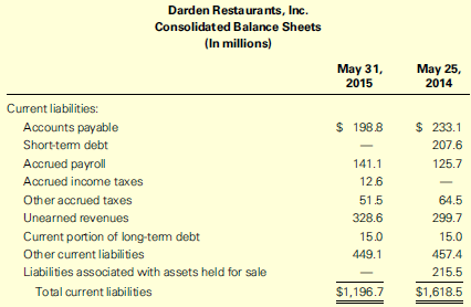 Darden Restaurants, Inc. Consolidated Balance Sheets (In millions) May 31, 2015 May 25, 2014 Current liabilities: Accounts payable $ 198.8 $ 233.1 Short-tem debt 207.6 Accrued payroll 141.1 125.7 Accrued income taxes 12.6 Other accrued taxes 51.5 64.5 Unearned revenues 328.6 299.7 Current portion of long-tem debt 15.0 15.0 Other current liabilities 449.1 457.4 Liabilities associated with assets held for sale 215.5 Total current liabilities $1,196.7 $1,618.5