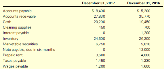 December 31, 2017 December 31, 2016 Accounts payable $ 8,400 $ 5,200 Accounts receivable 27,830 35,770 Cash 20,200 19,450 Cleaning supplies Interest payable 450 700 1,200 Inventory 24,600 26,200 Marketable securities 6,250 5,020 Note payable, due in six months 12,000 Prepaid rent 3,600 4,800 Taxes payable 1,450 1,230 Wages payable 1,200 1,600
