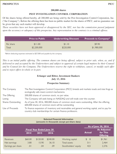 PROSPECTUS PICC 200,000 shares PEST INVESTIGATION CONTROL. CORPORATION Of the shares being offered hereby, all 200,000 are being sold by the Pest Investigation Control Corporation, Inc. ("the Company"). Before the offering there has been no public market for the shares of PICC, and no guarantee can be given that any such market will devekop. These securities have nor been approved or disapproved by the SEC, nor has the cowwmission passed judgment upon the accuracy or adequacy of this prospectus. Any representation to the contrary is a criminal offense. Price to Public Underwriting Discount Proceeds to Company Per share $1.00 $1.10 $9.90 Total $2,200,000 $220.000 $1,980,000 "Tefore dedacting esperoes estmuned at $27,000 and payable by the company This is an inizial public ofering. The cowwwon shares are being offered, subject to prior sale, when, as, and if delivered to and accepted by the Underwriters and subject to approval of certain legal matters by their Counsel and by Counsel for the Company. The Underwriters reserve the right to withdraw, cancel, or modify such offer and to reject offers in whole or in part. Erlanger and Ritter, Investment Bankers July 13, 2016 Prospectus Summary The Company The Pest Investigation Control Corporation (PICC) breeds and markets toads and tree frogs as ecologically safe insect-control mechanisms. 200,000 shares of common stock, no par vakue. The Offering Listing Shares Outstanding The Company will seek listing on NASDAQ and will trade over the counter. As of June 30, 2016, 400,000 shares of common stock were outstanding, After the offering. 600,000 shares of common stock will be outstanding Use of Proceeds To finance expansion of inventory and receivables and general working capital, and to pay for country dub memberships for certain finance professors. Selected Financial Information (amounts in thousands except pershare data) As of June 30, 2016 As Adjusted Fiscal Year Ended June 30 Actual for This 2014 2015 2016 Offering Revenues $60.00 $120.00 $240.00 Working capital $1,961 Net earmings 3.80 15.90 36.10 Total assets 511 2,464 Earnings per share 04 .09 Stockholders' equity 423 2,376