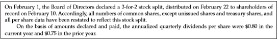 On February 1, the Board of Directors declared a 3-for-2 stock split, distributed on February 22 to shareholders of record on February 10. Accordingly, all numbers of common shares, except unissued shares and treasury shares, and all per share data have been restated to reflect this stock split. On the basis of amounts declared and paid, the annualized quarterly dividends per share were $0.80 in the current year and $0.75 in the prior year.